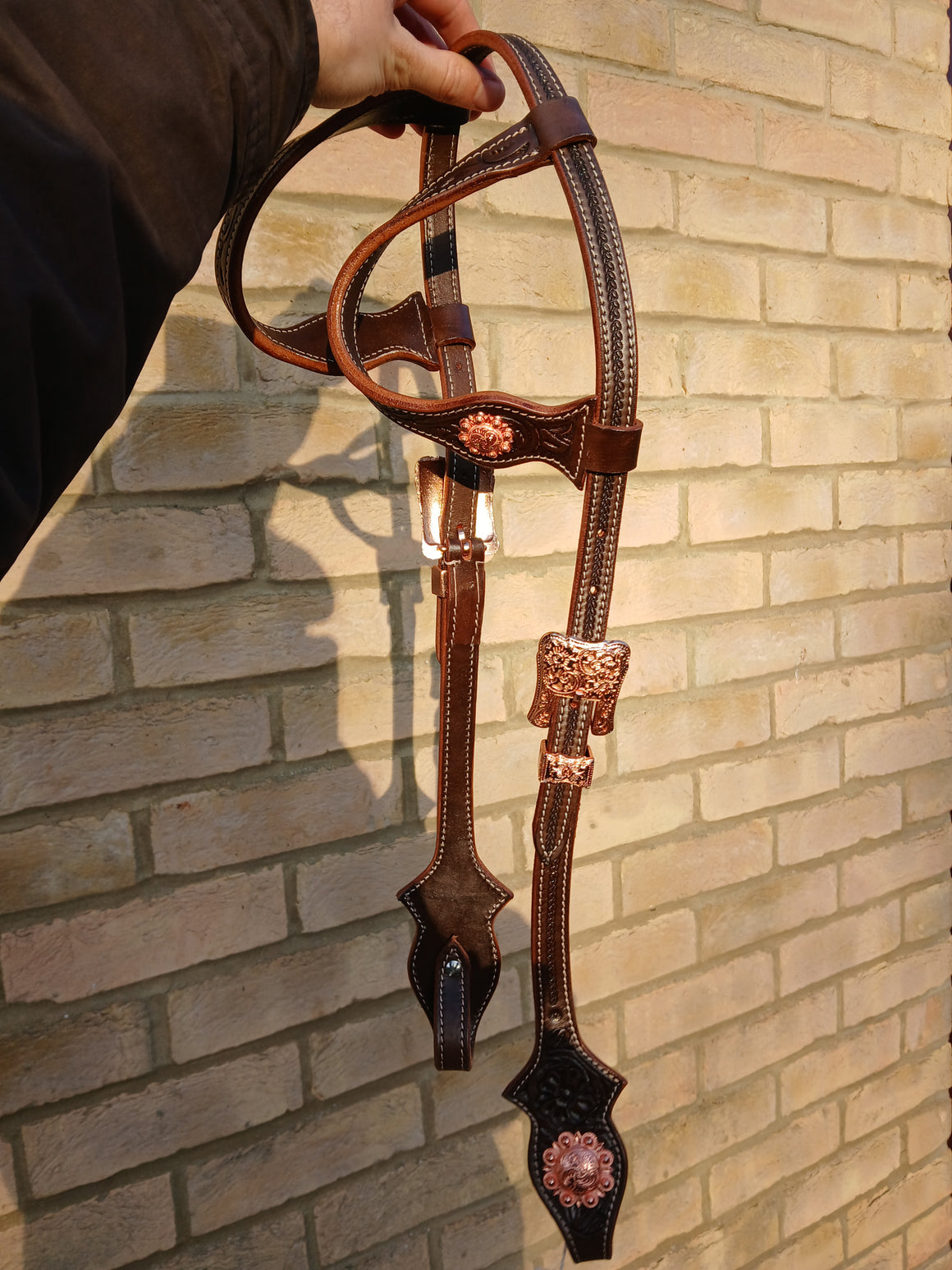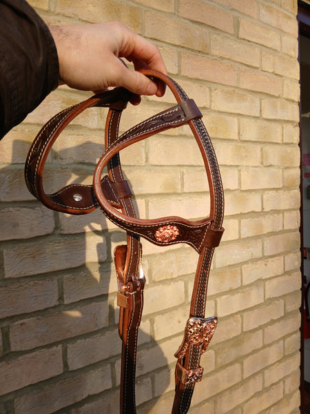 High quality, white stitched, dark brown leather show headstall with copper accents.