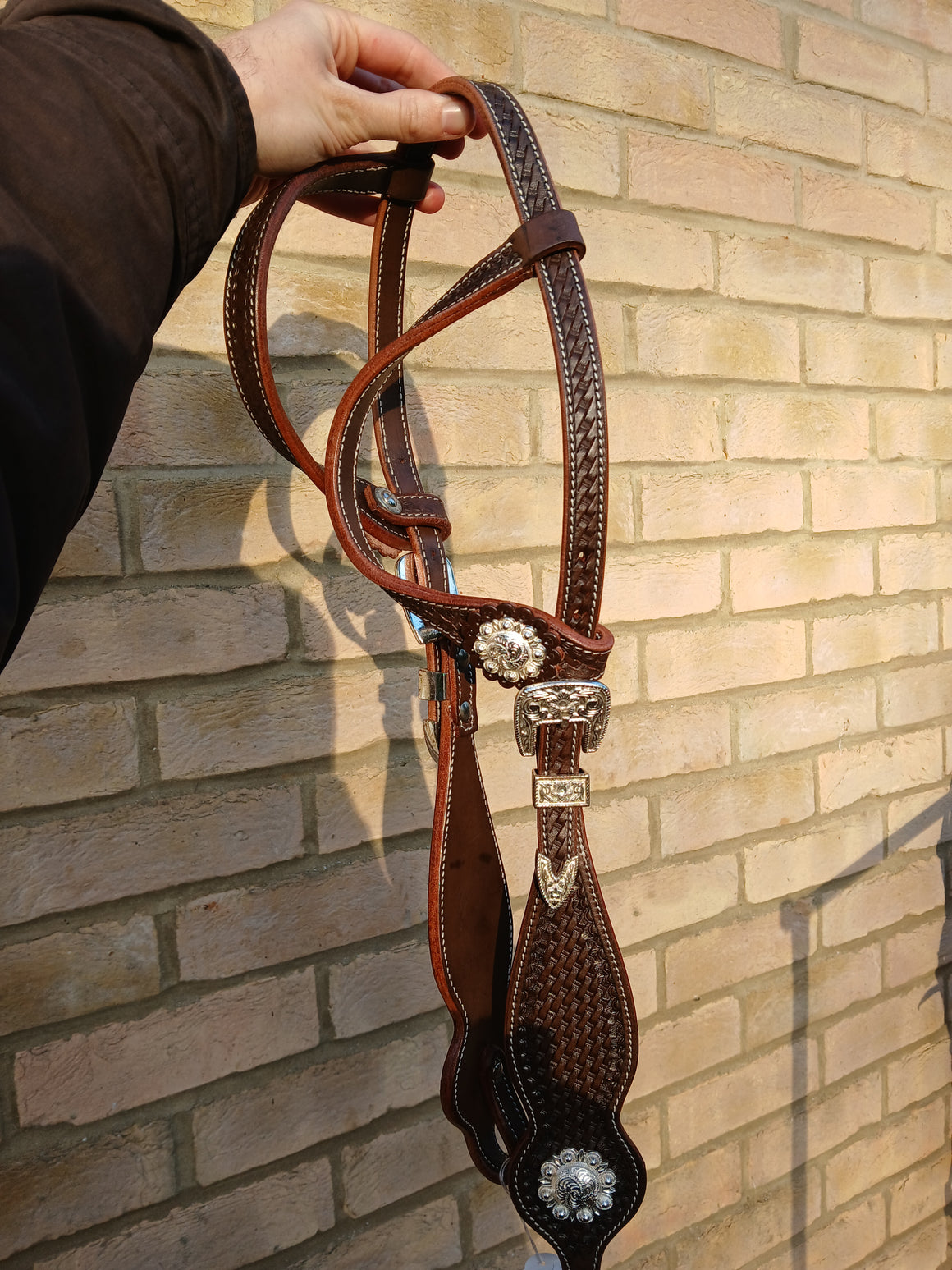 High quality, white stitched, dark brown leather show headstall with silver accents.