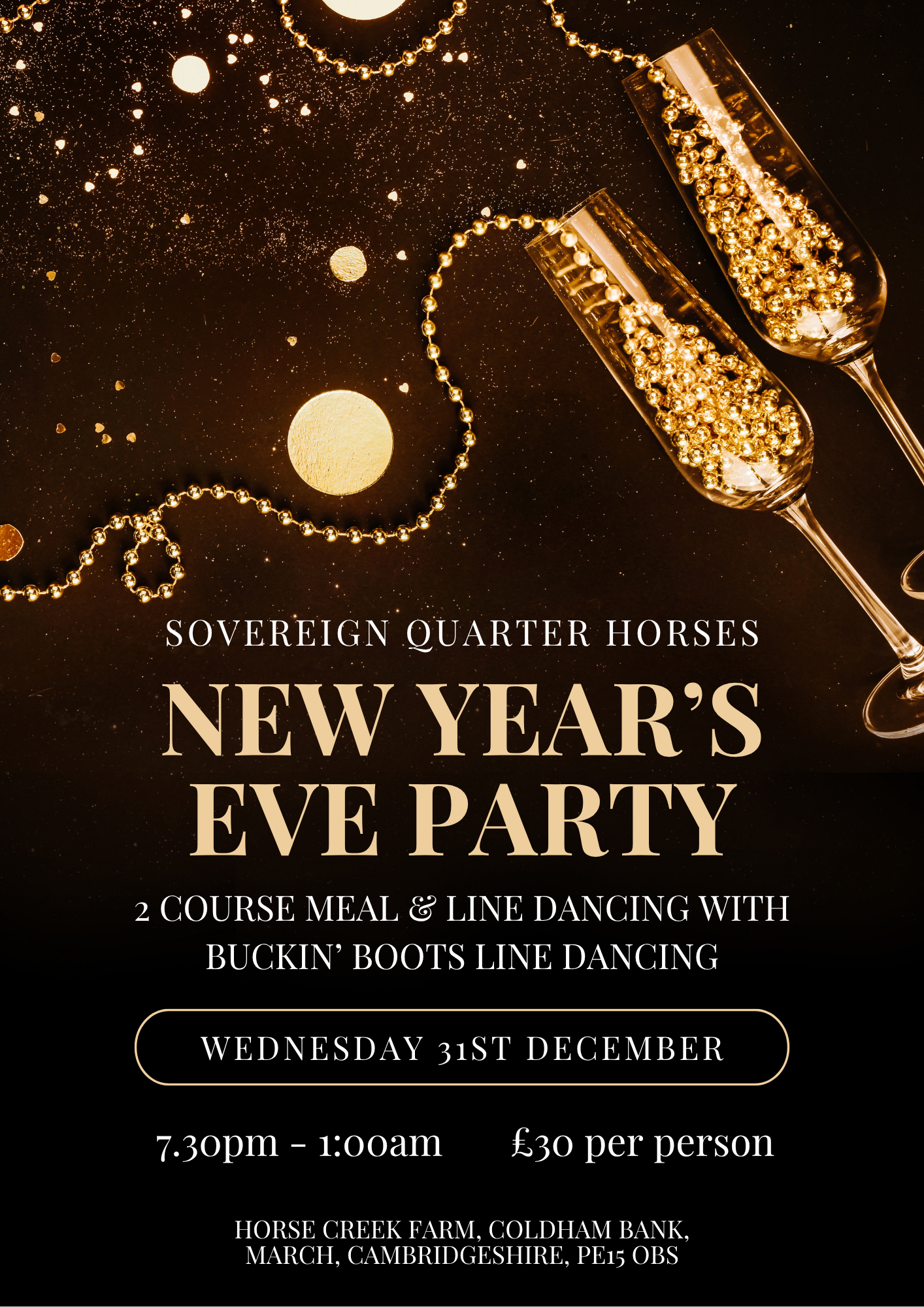 The team at Sovereign Quarter Horses and the Horse Creek Saloon are excited to be welcoming you all this December 31st. Each ticket gives you access to the Horse Creek Saloon venue and bar, a two course meal with prosecco and a packed night of line dancing with Amy of Buckin' Boots Line Dancing!